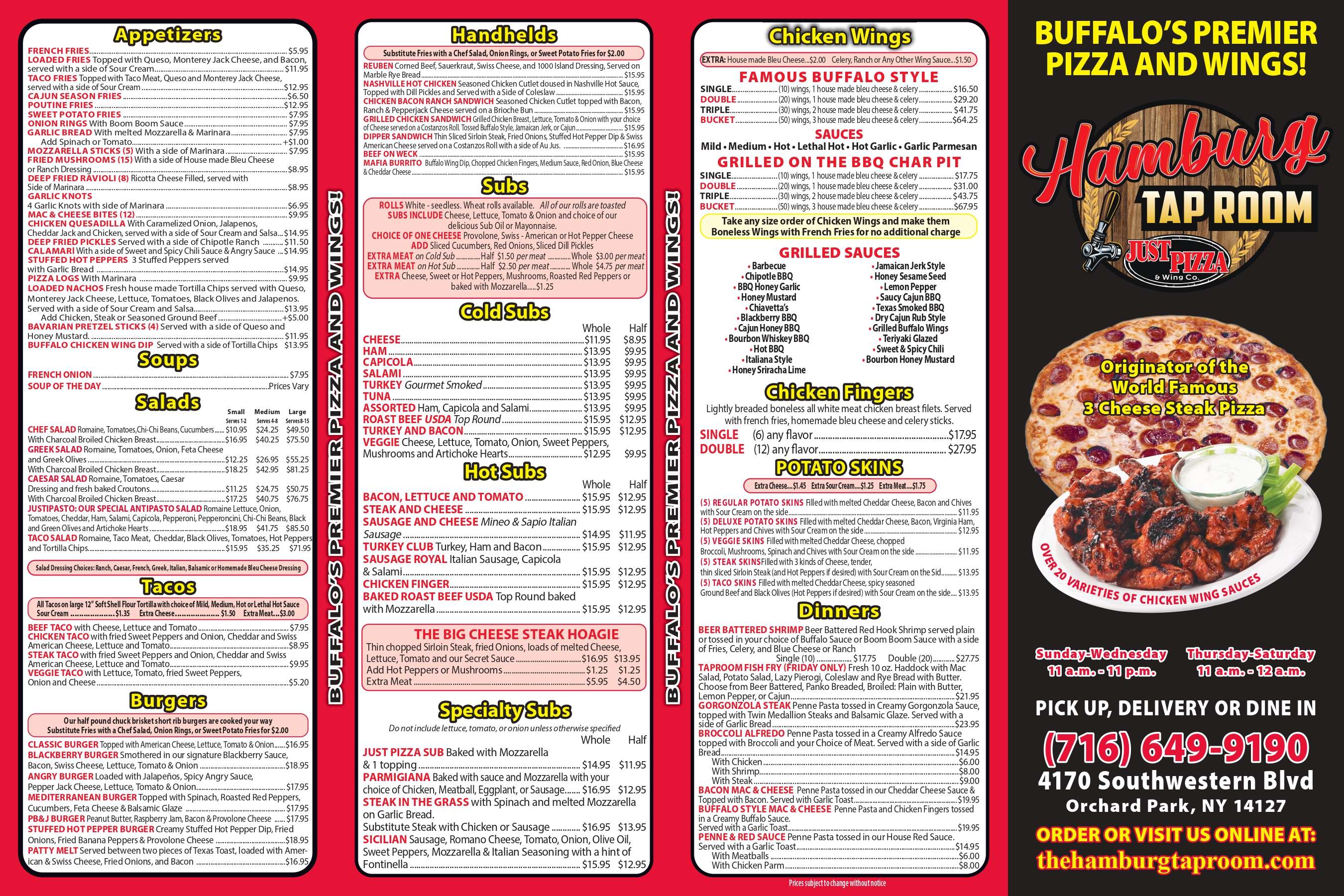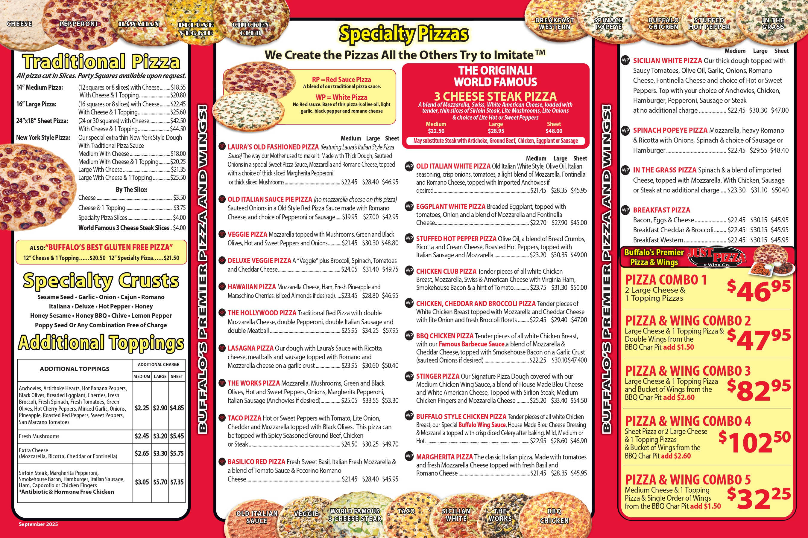 We Create the Pizzas All the Others Try to Imitate TM | RP (Red Sauce Pizza, A blend of our traditional pizza sauce) | WP (White Pizza, No Red sauce, base of this pizza is olive oil, light garlic, black pepper and romano cheese) • Toppings: Anchovies, Artichoke Hearts, Hot Banana Peppers, Black Olives, Breaded Eggplant, Cherries, Fresh Broccoli, Fresh Spinach, Fresh Tomatoes, Green Olives, Hot Cherry Peppers, Minced Garlic, Onions, Pineapple, Roasted Red Peppers, Sweet Peppers, San Marzano Tomatoes (Medium +$2.25 | Large +$2.90 | Sheet +$4.85) • Fresh Mushrooms (Medium +$2.45 | Large +$3.20 | Sheet +$5.45) • Extra Cheese: Mozzarella, Ricotta, Cheddar or Fontinella (Medium +$2.65 | Large +$3.30 | Sheet +$5.75) • Sirloin Steak, Chicken Sausage, Margherita Pepperoni, Smokehouse Bacon, Hamburger, Italian Sausage, Chicken, Ham, Capocollo or Chicken Fingers (Medium +$3.05 | Large +$5.70 | Sheet +$7.35) • Antibiotic & Hormone Free Chicken (Medium +$3.05 | Large +$5.70 | Sheet +$7.35)